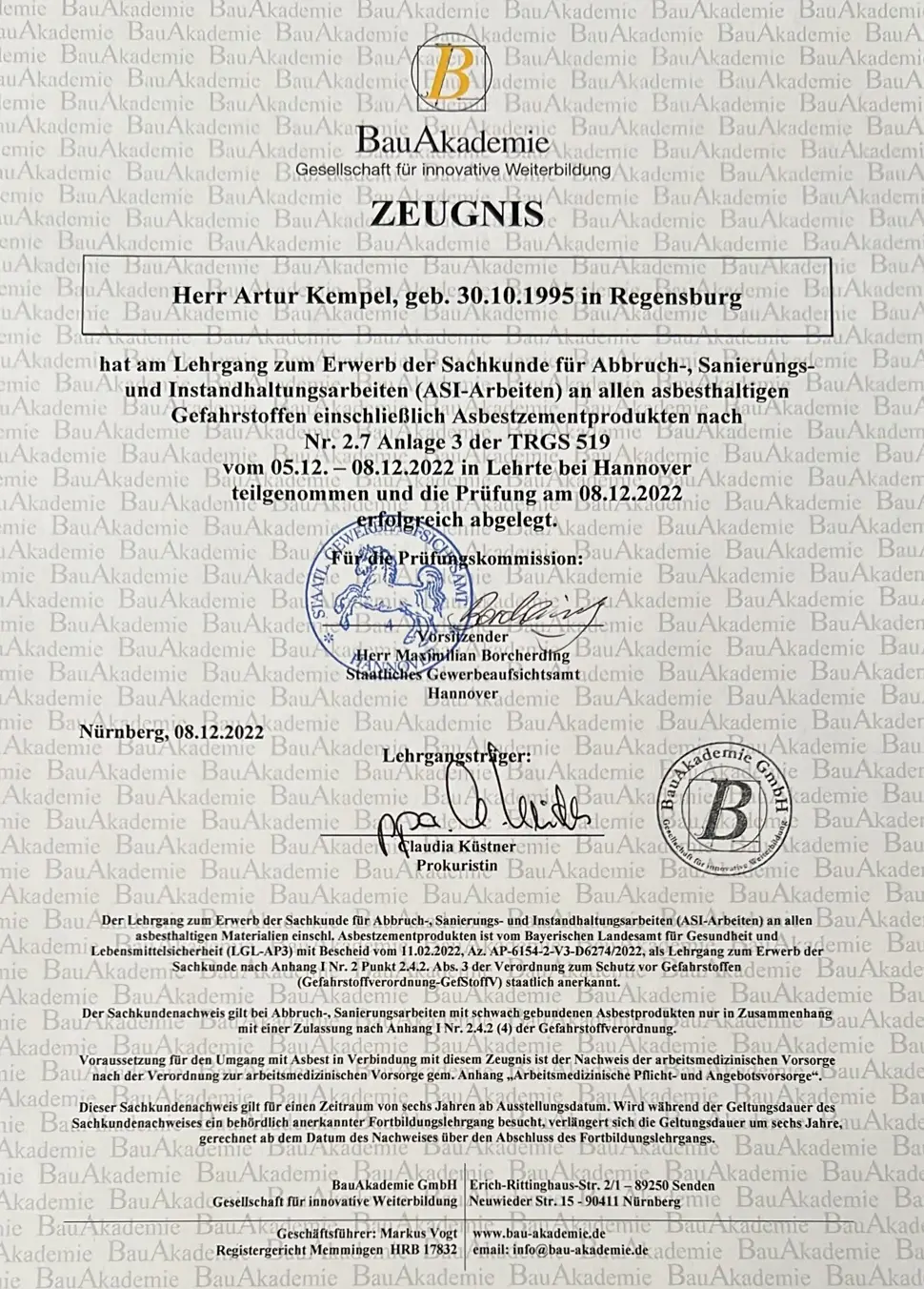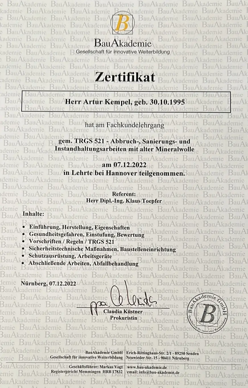 Fachkundelehrgang Abbruch,- Sanierungs- und Instandhaltungsarbeiten an allen asbesthaltigen Gefahrstoffen
